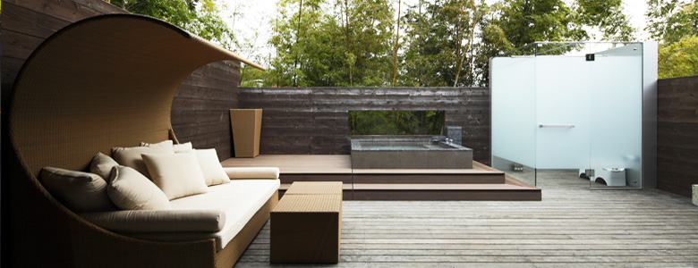 バルコニーに出ると目の前に広がる水盤。そこから繋がる地下露天風呂は、ガラスに囲まれたデザイナーズルームの名にふさわしい癒しの場所。ライトアップされたヒメシャラを観賞しながらの入浴は、身も心もリフレッシュできます。
