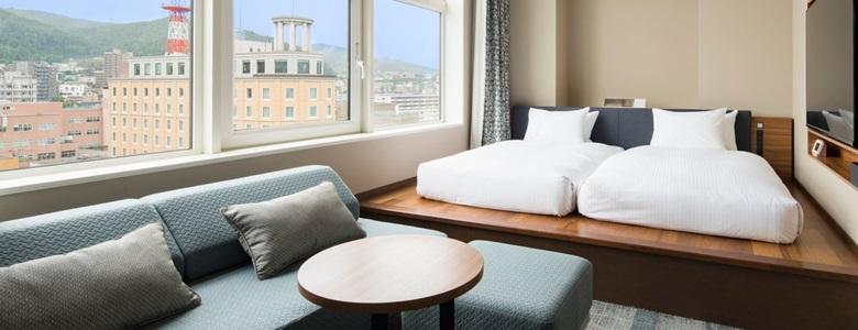 小樽駅から徒歩9分、観光エリア『小樽運河』や『堺町通り』まで徒歩4分の好立地! 様々なニーズに応えた多彩な客室と、最上階には小樽の街並みと石狩湾を望む露天付き大浴場をご用意しております。