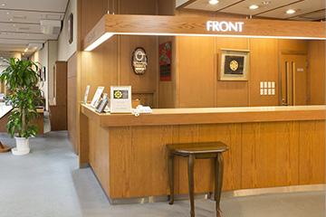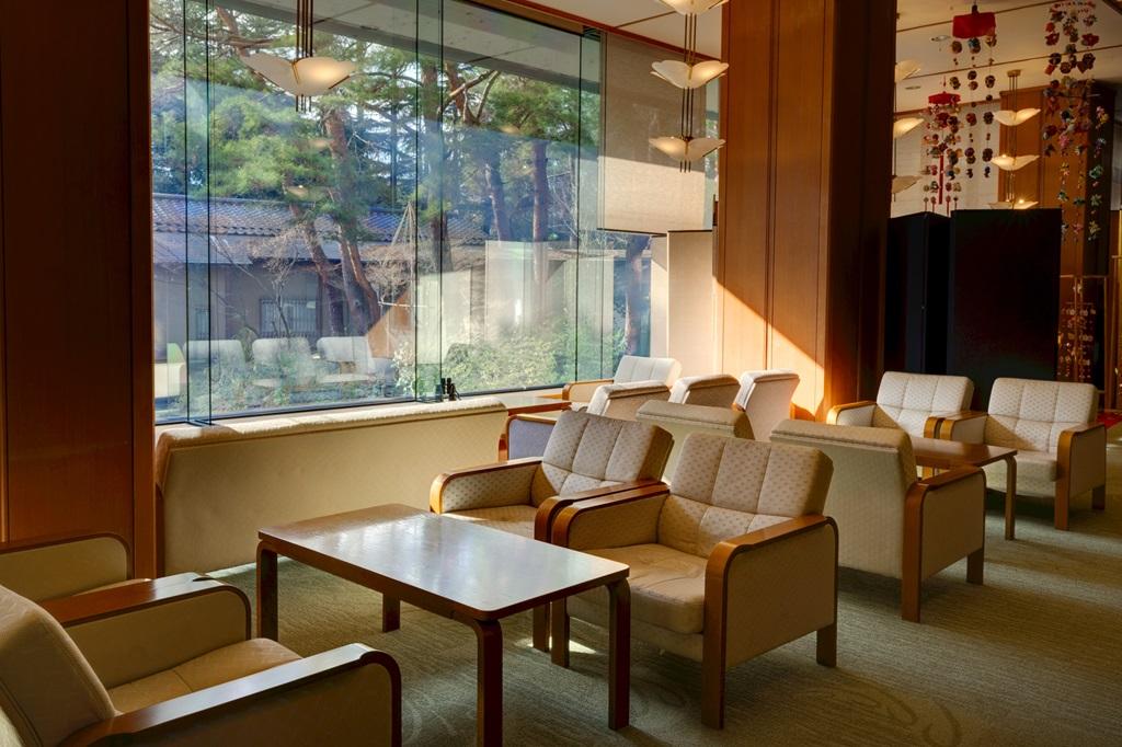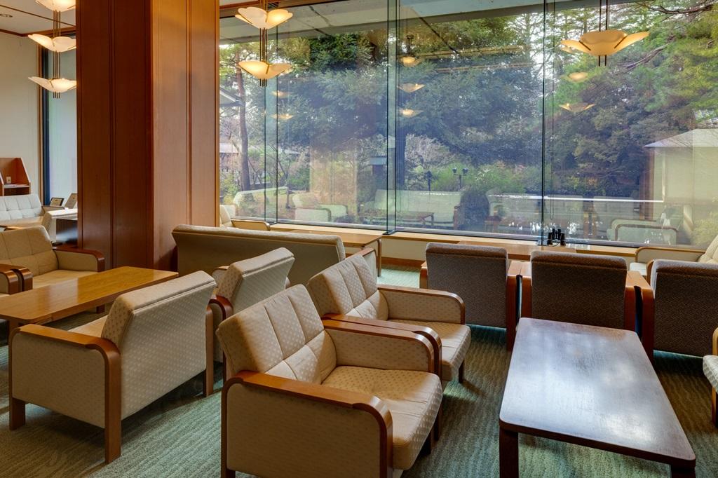開放的なロビーの窓から望む庭園は一枚の絵画のようで、春は桜、...