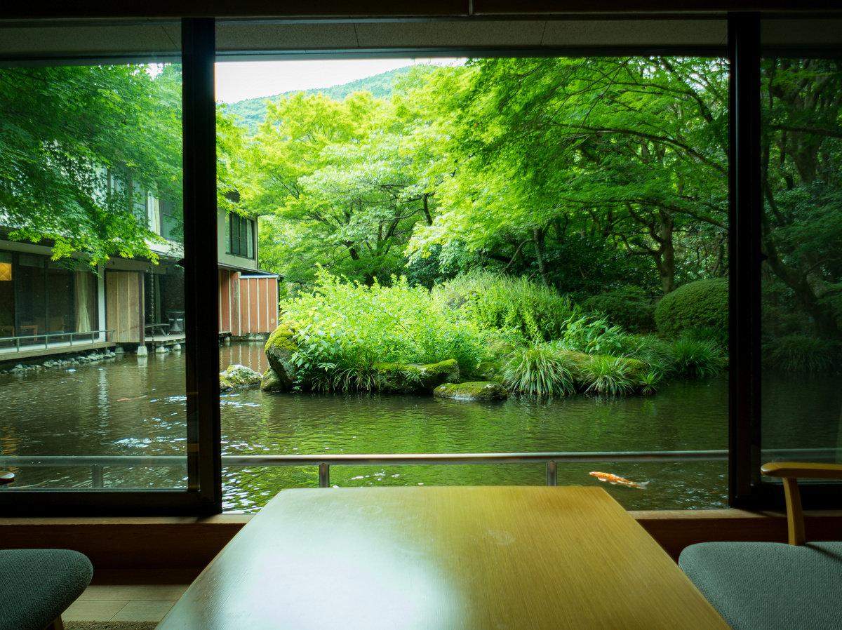 【館内】ロビー入口。窓の向こうに池庭が広がります