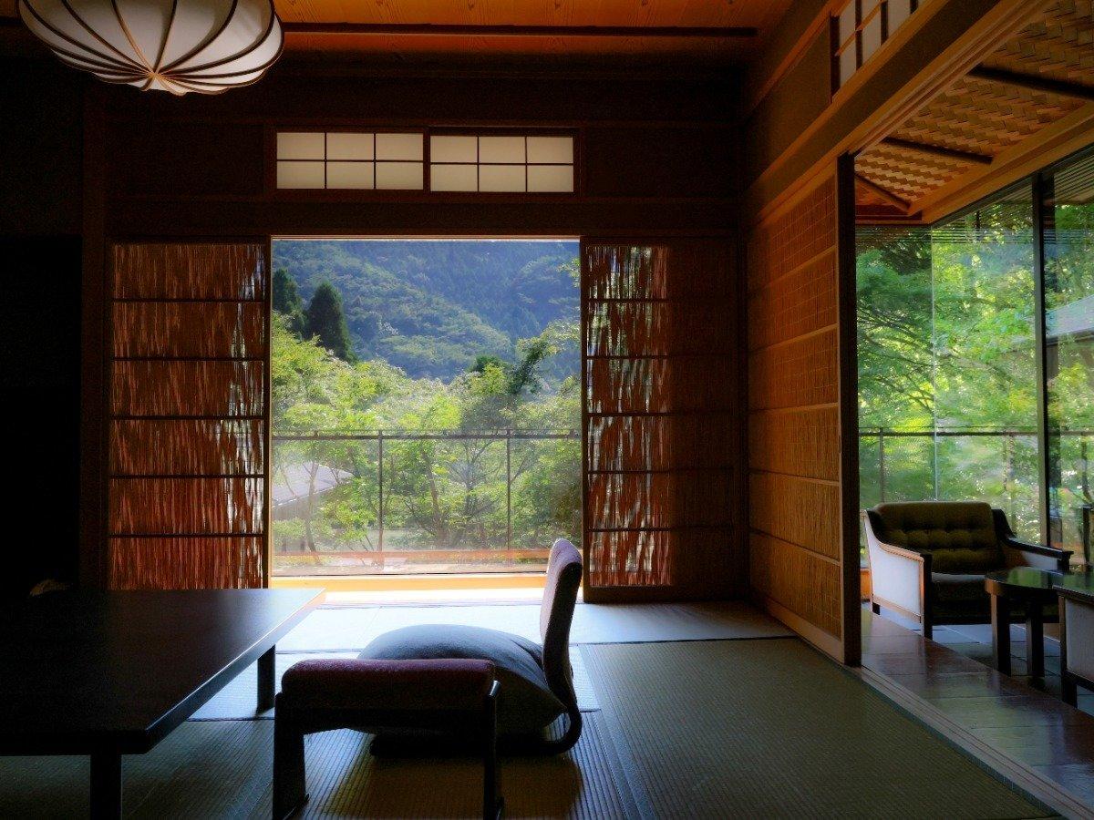 ■海石榴の館内から望む美しい山の風景です。四季により色鮮やか...