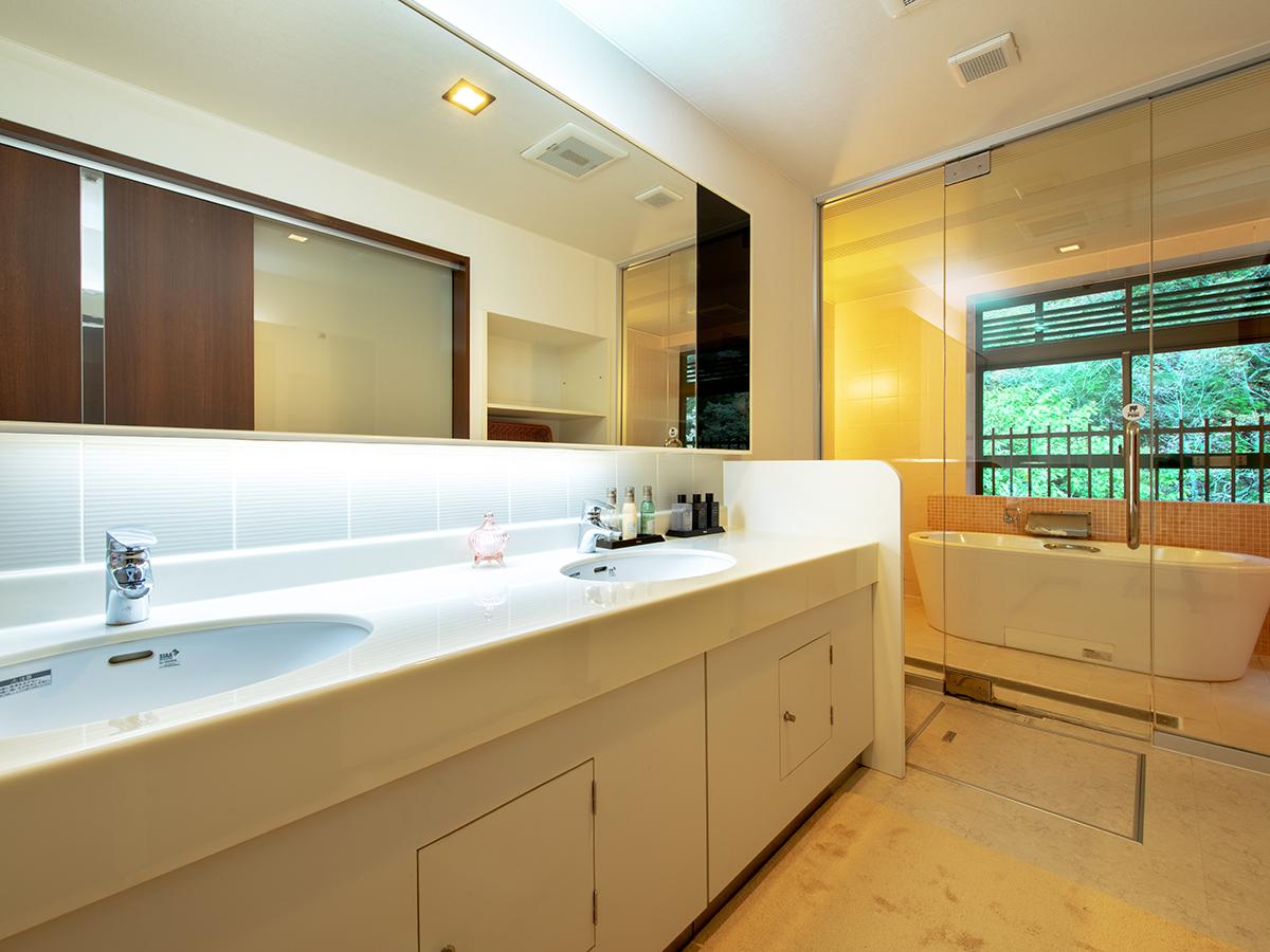 源泉かけ流し風呂付和室の洗面と浴室