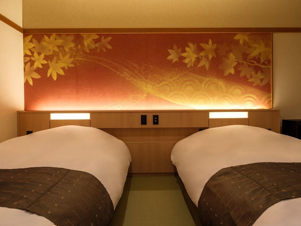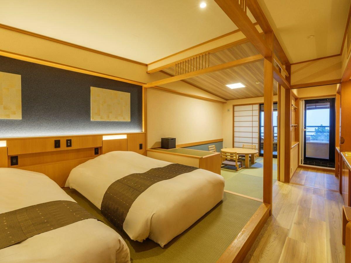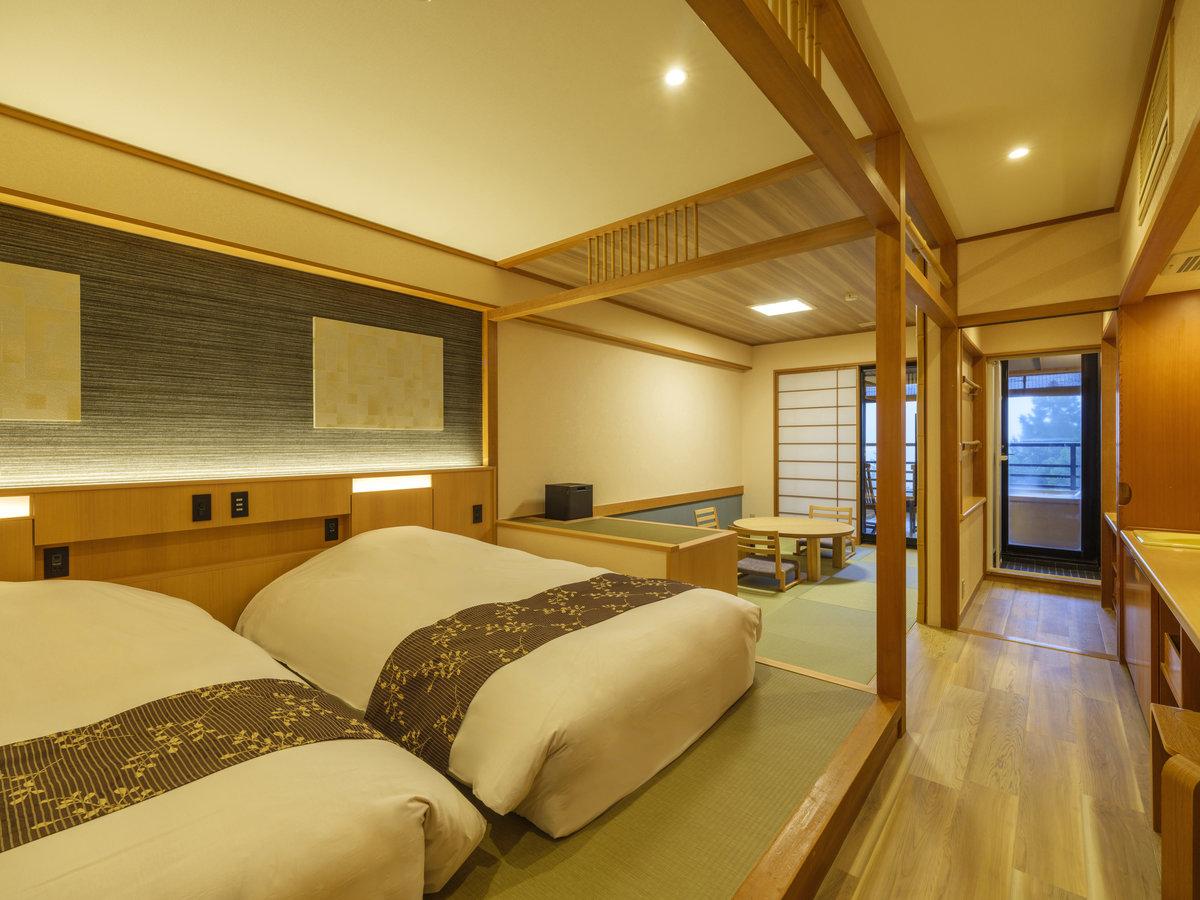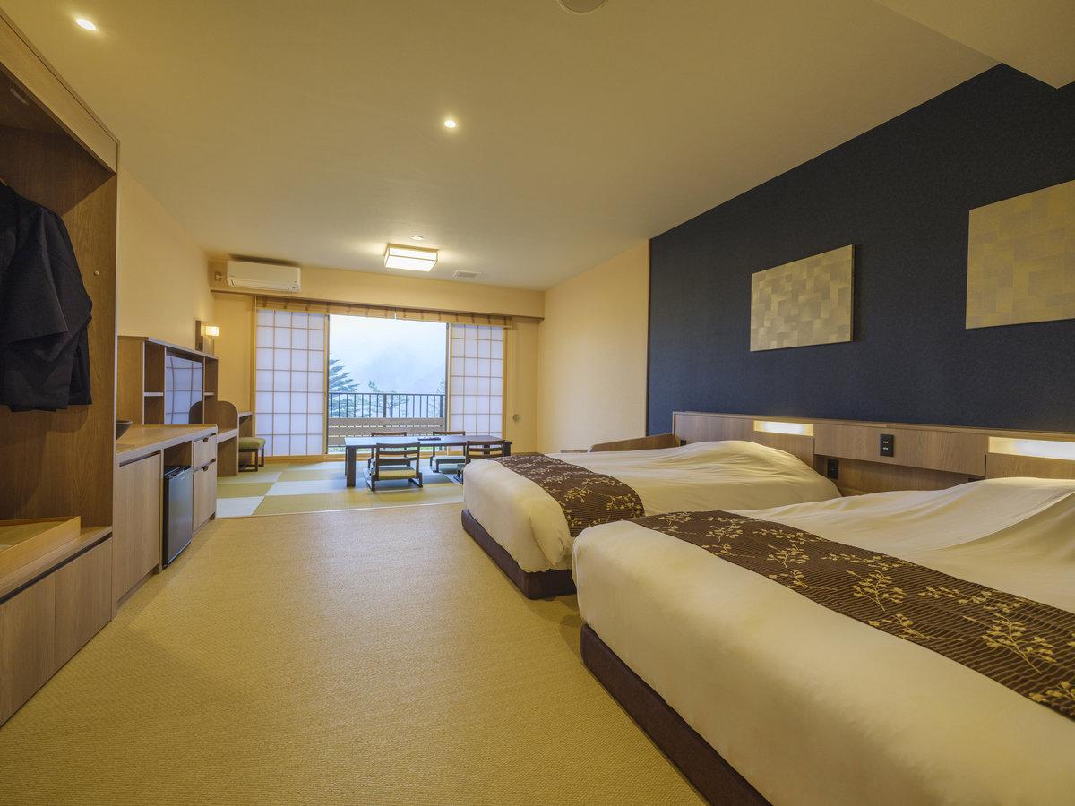 【檜露天風呂付き和洋室】ベッド2台+6畳和室。布団を追加し、...