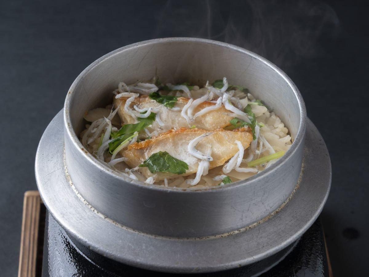 【夕食】すぐそばで炊き上げる釜飯。良い香りが食欲をそそる。