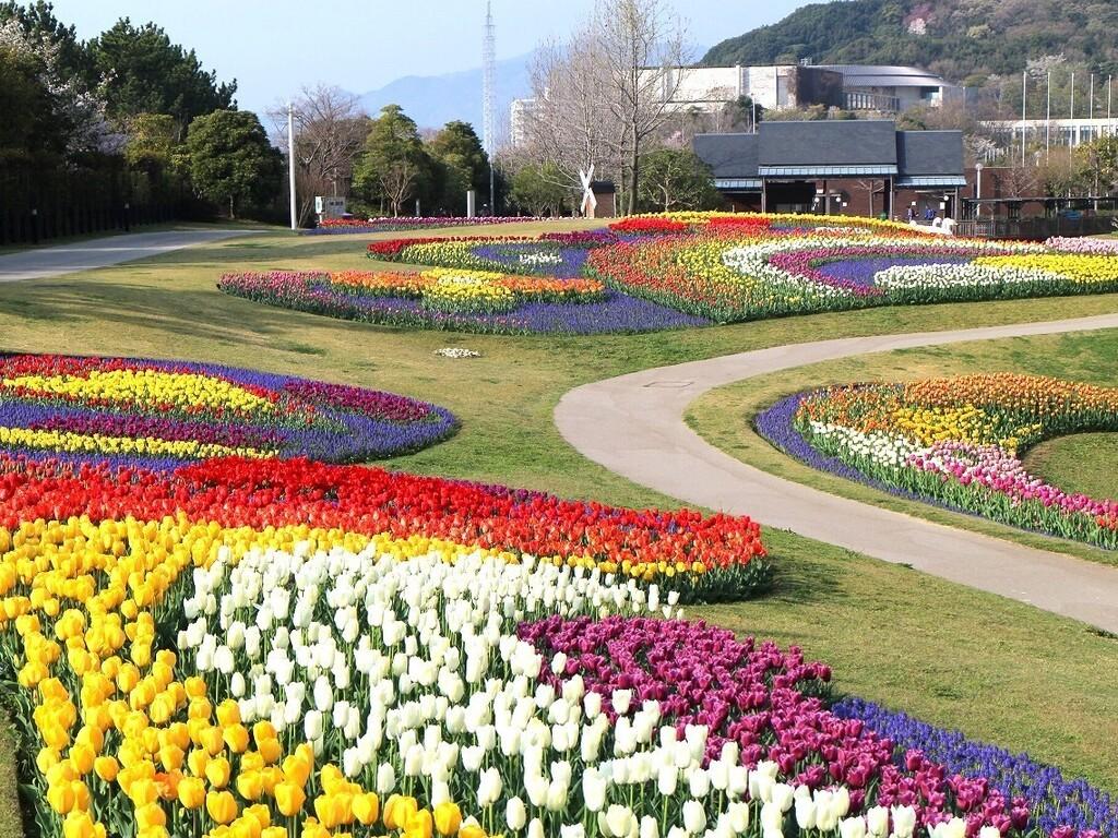 「淡路島国営明石海峡公園」ポプラの丘から見たチューリップ群