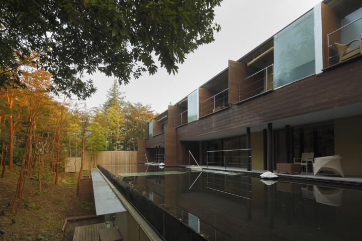 お部屋の広さが93.98㎡。居室と地下露天風呂を水盤が隔てる...