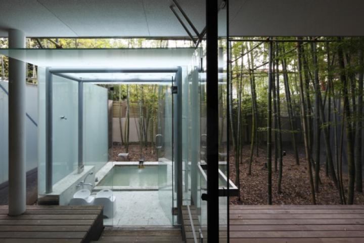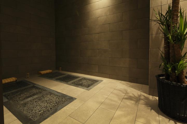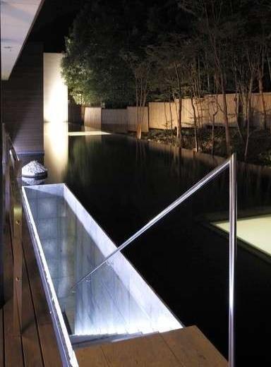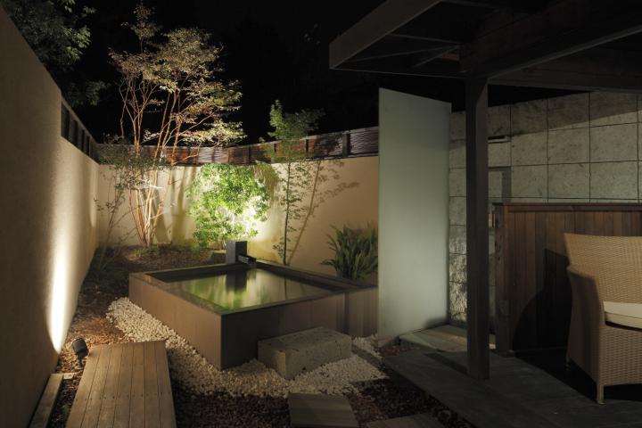 水盤の下へと続く、露天風呂への階段を降りると、ゆったりとした...