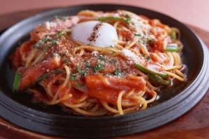 ・ 昔ながらのナポリタン鉄板焼き 温泉玉子添え