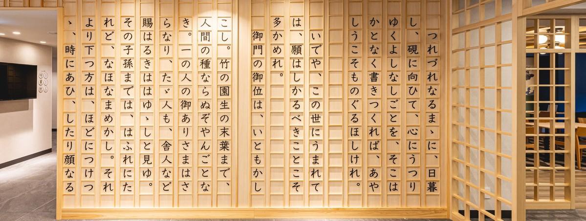 歴史や季節のうつろい、日本ならではの美意識や美徳感。 当館ではこの京都の地で発祥した吉田兼好による徒然草や百人一首など、 “日本の地で綴られた言葉” を空間の表現として用いております。 ほんの少し立ちどまり、昨日までの自分と明日からの自分をつなぎ合わせる旅。 ご自分への言葉、大切な方への手紙。 様々に綴る旅をお楽しみください。