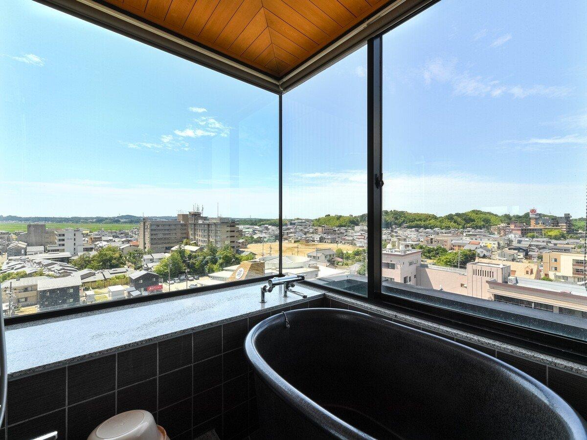 【本館十楽棟最上階】和室(ベッド付き):浴室の窓からの眺望を...