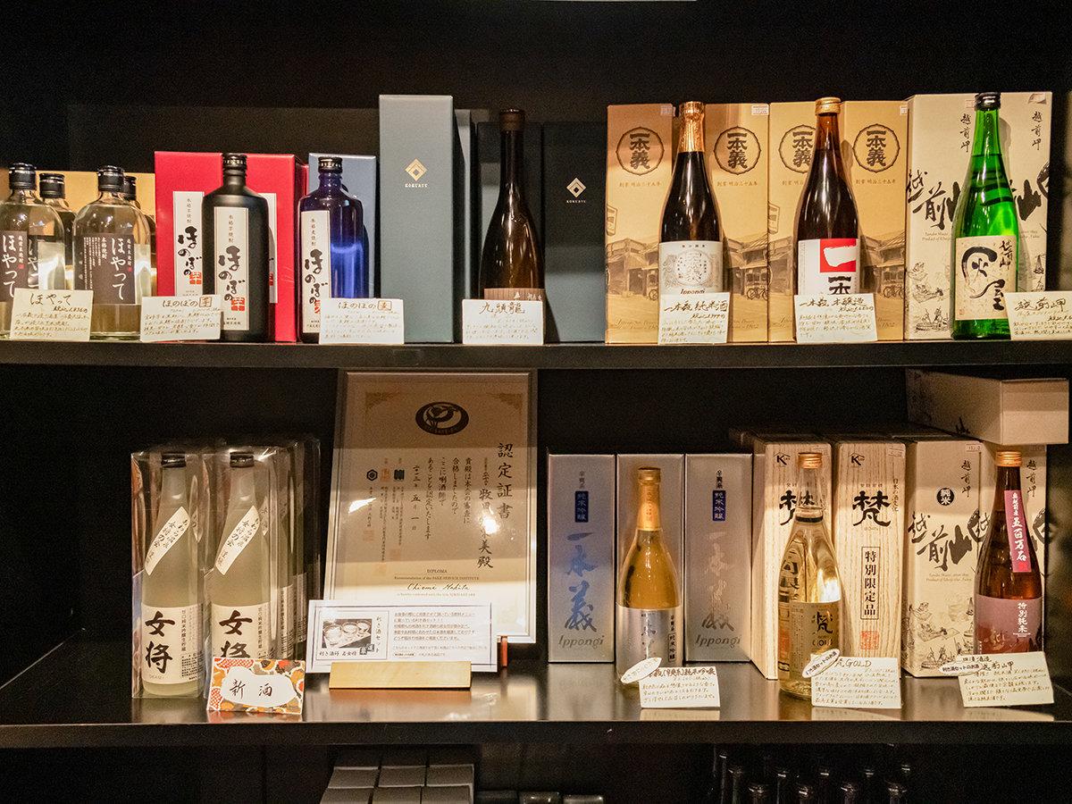 【売店】地酒が並ぶ売店の1スペース。あわら温泉オリジナルの「...