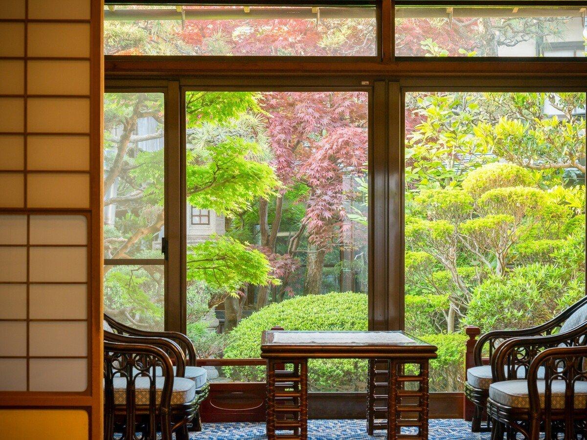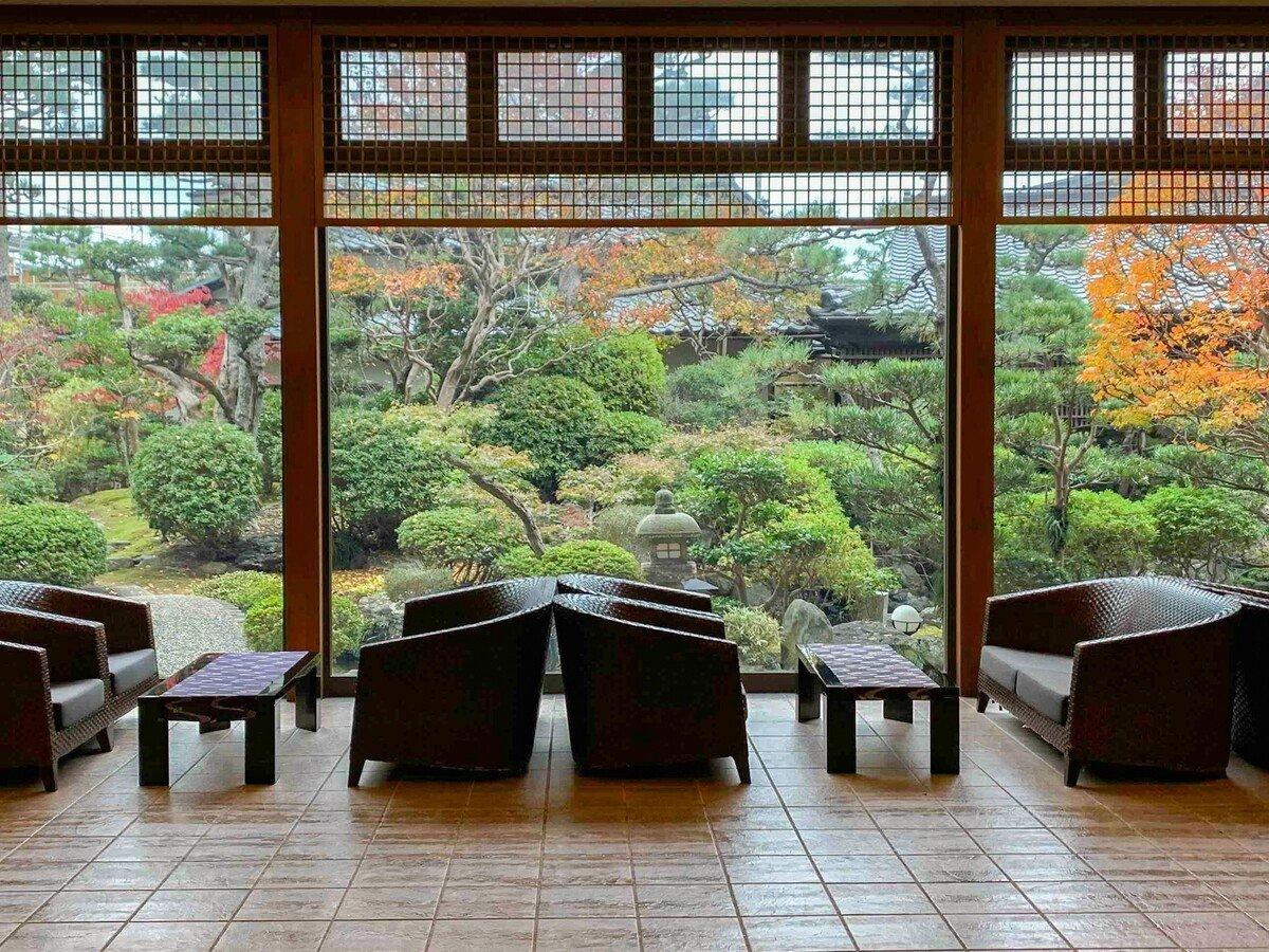 【エントランスロビー】ロビーから見るお庭。秋の紅葉を眺めなが...