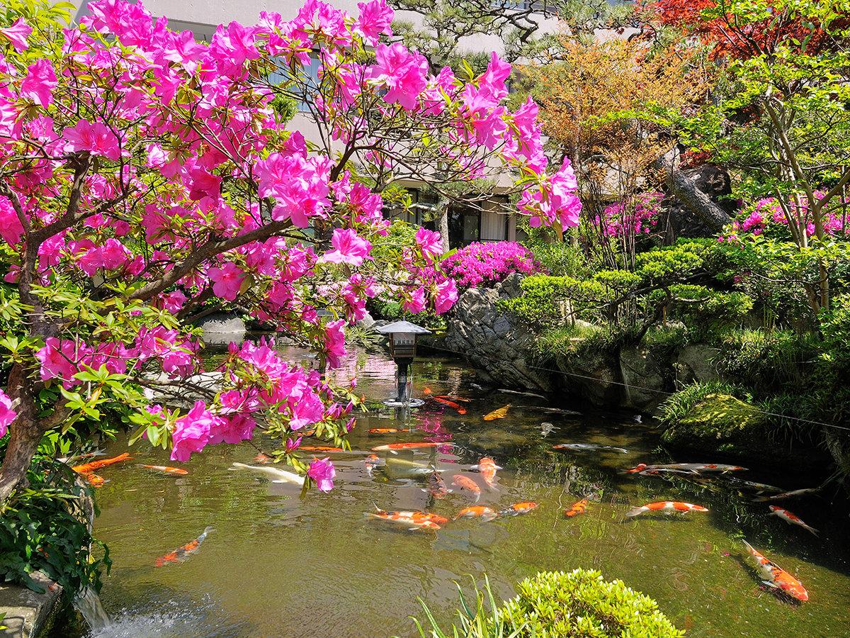 【庭園】<ツツジ>春の暖かい日差しの中、お花や池を優雅に泳ぐ...