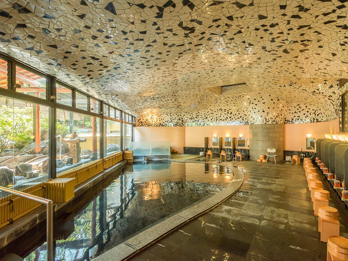 【大浴場:陽だまりの湯】内風呂:広々とした大浴場から見える庭...