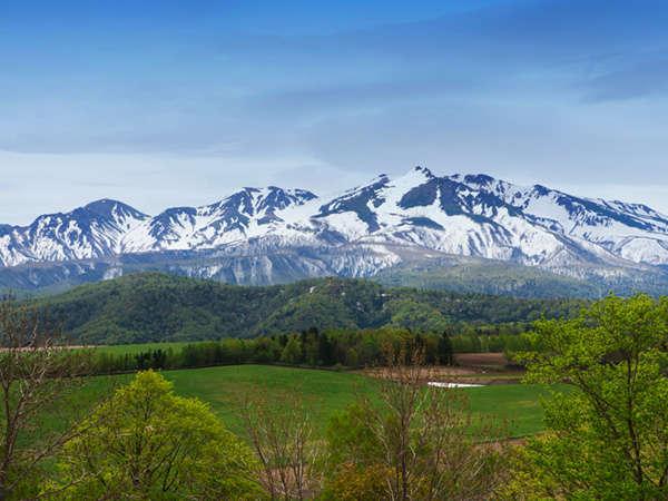 丘の上から大雪山の峰々の勇姿と目の前に広がる雄大な牧草地と畑...