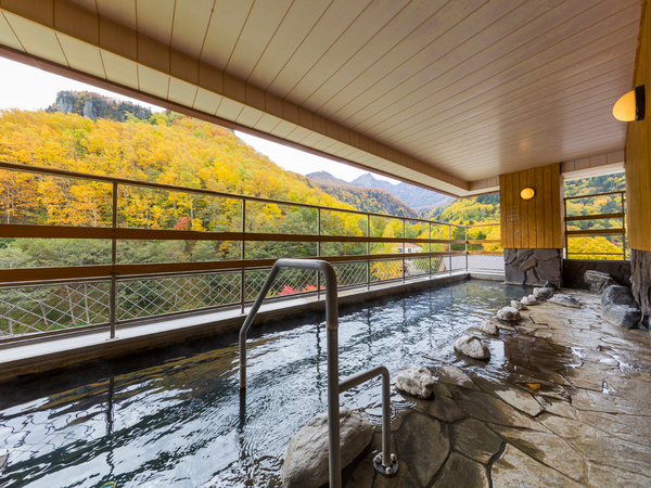 【大雪乃湯(秋)】大きな窓から層雲峡の景色を一望。ちょっと色...