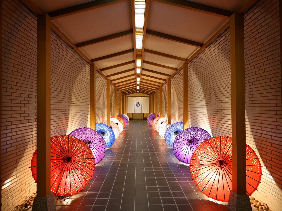 【食事処・華堂 扇翠】暖簾をくぐり食事処入口へと向かう通路の...
