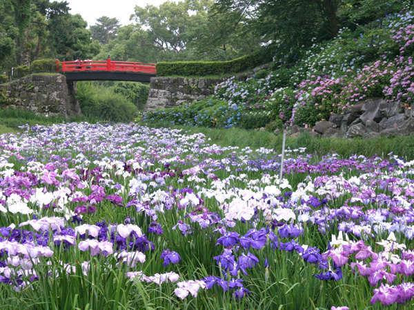 ■小田原城東堀にある花菖蒲園では、6月になると花菖蒲とあじさ...