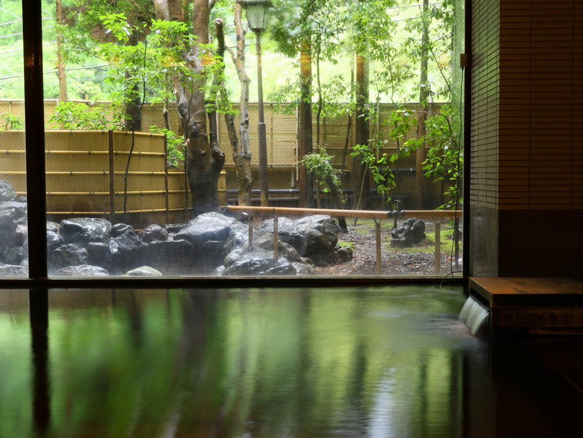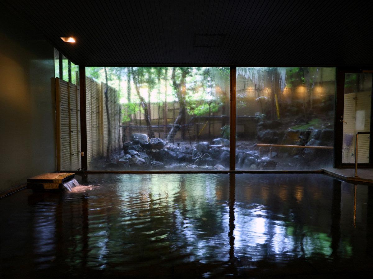 【大浴場】黒御影石に縁取られた伊豆石の浴槽。大きな全面ガラス...