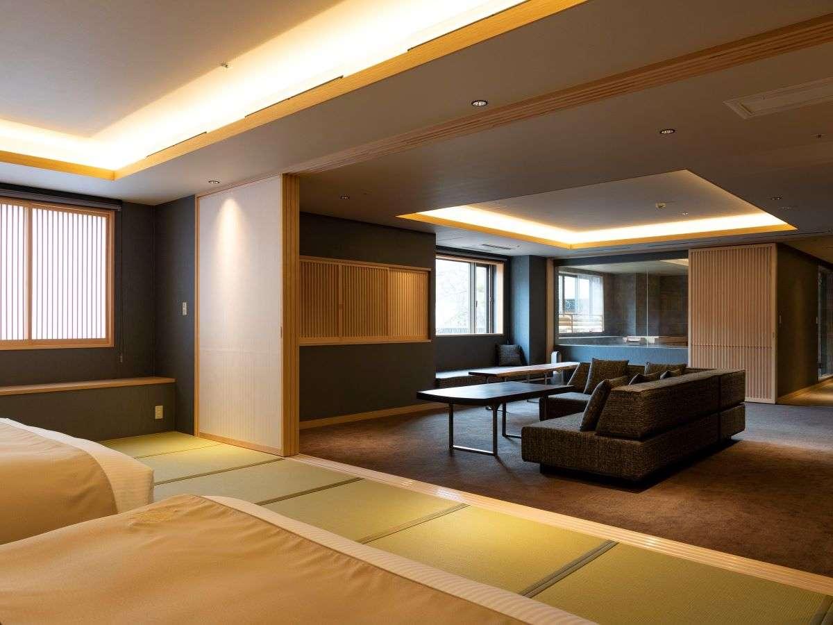【山側の温泉&寝湯付客室「連珠」(160平米)】広々としたリ...