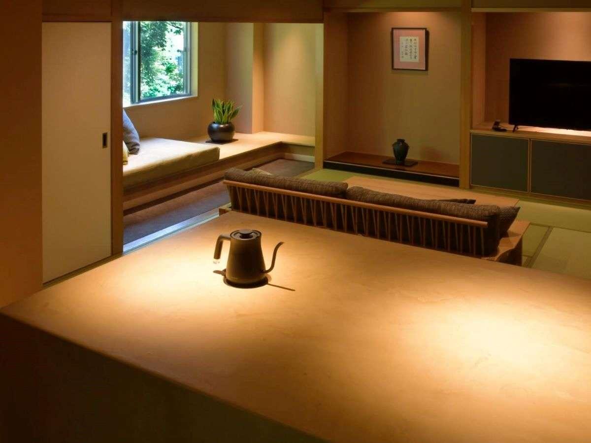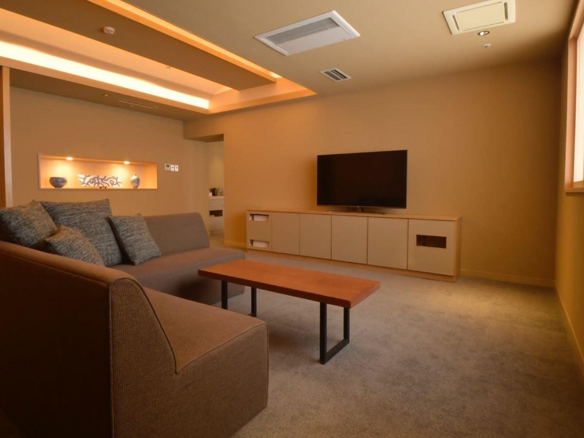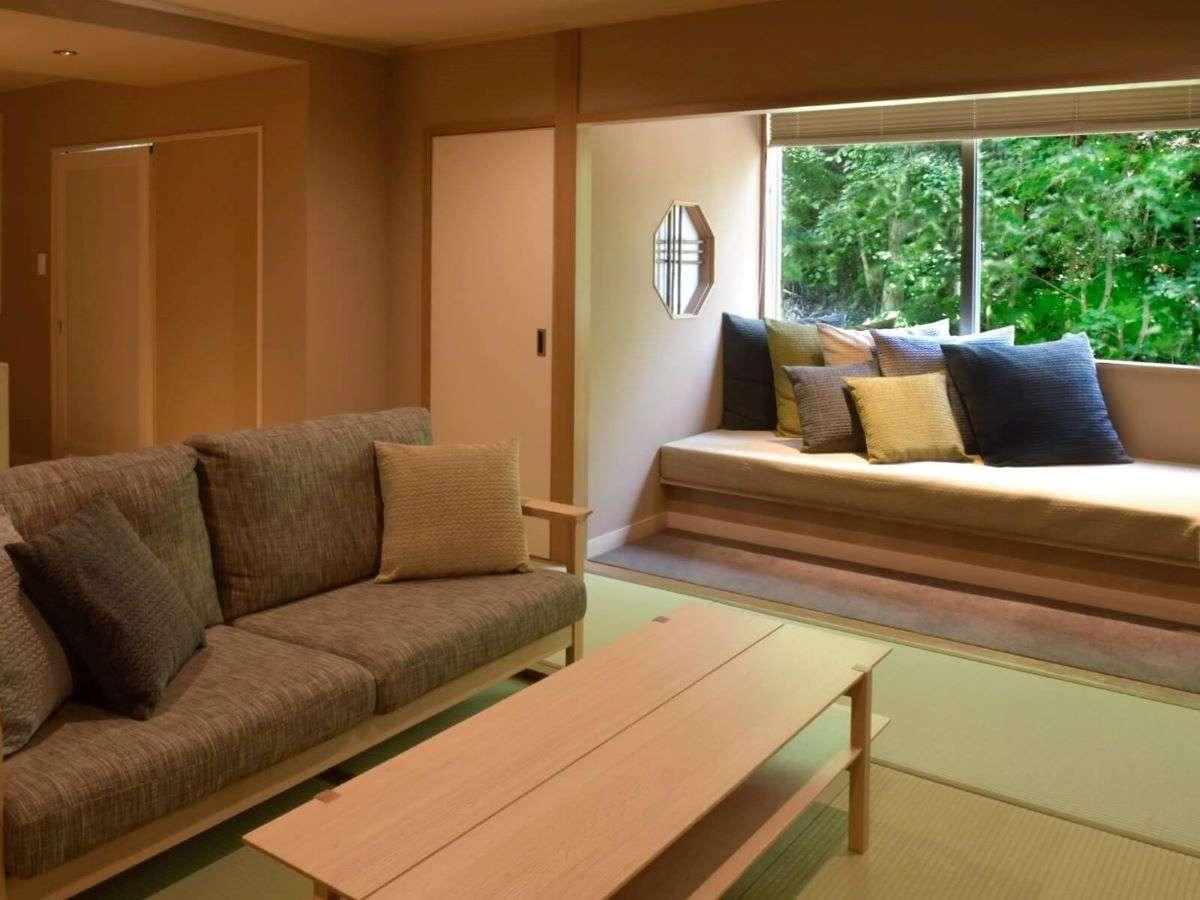 【街側の温泉&寝湯付客室「松風」(120平米)】手前リビング...