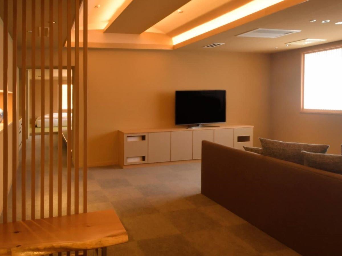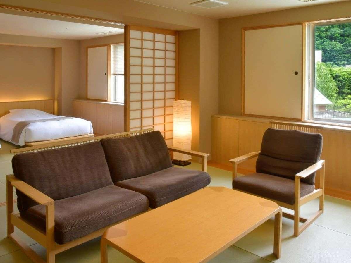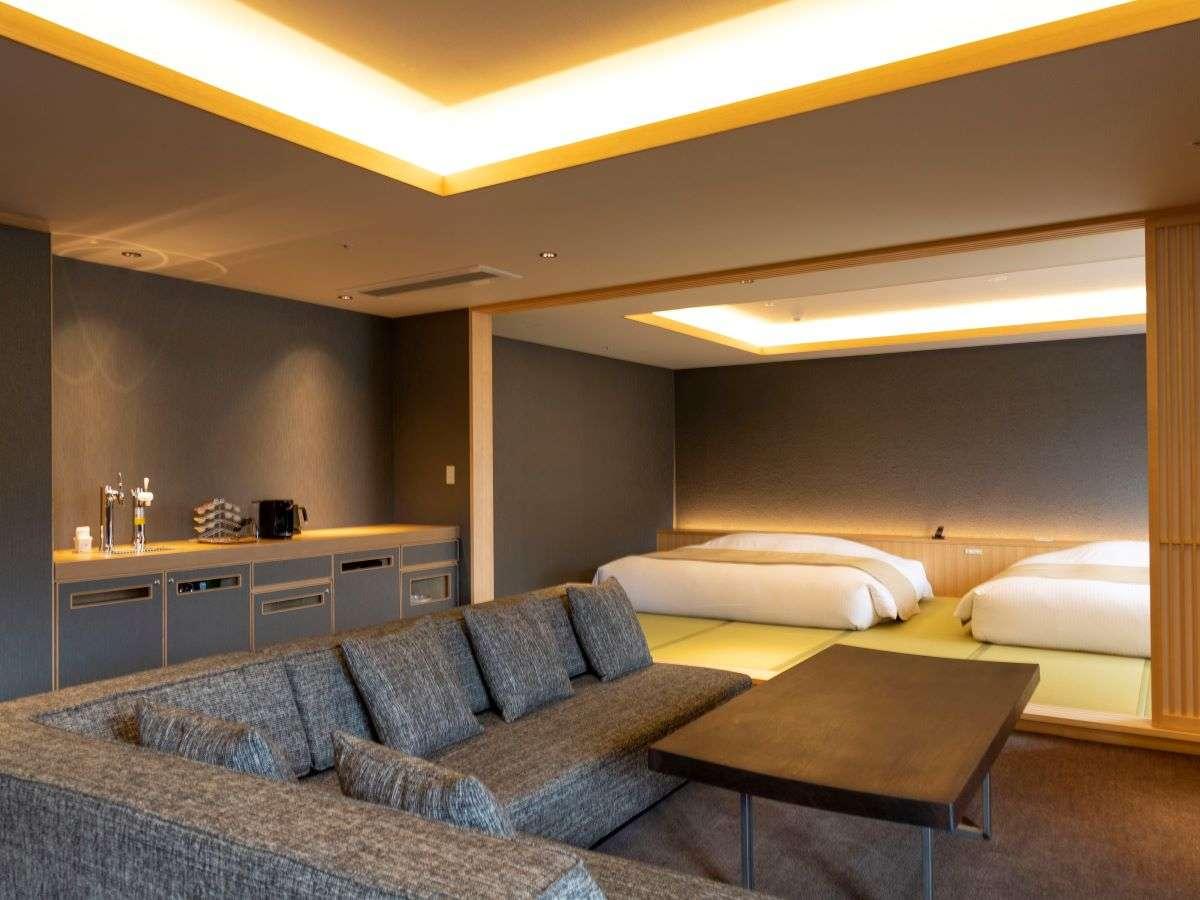 【街側の温泉&寝湯付客室「松風」(120平米)】手前リビング...