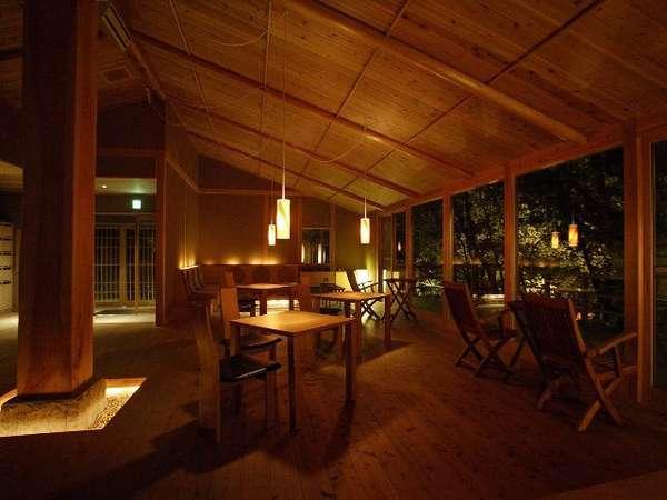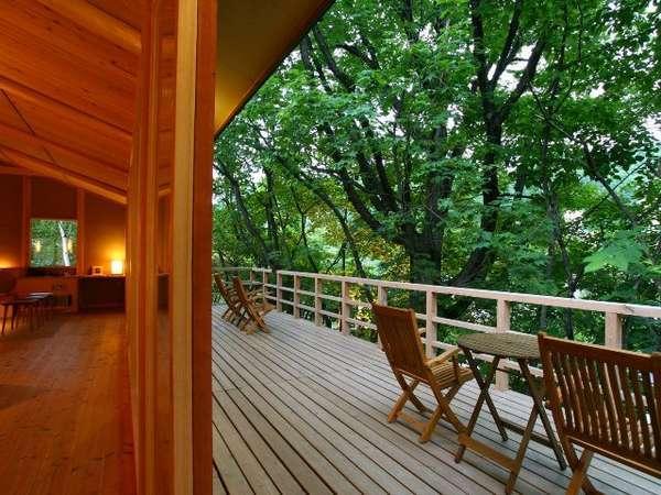 【離れの湯屋「森乃湯」】湯上がりラウンジとウッドデッキ。心地...