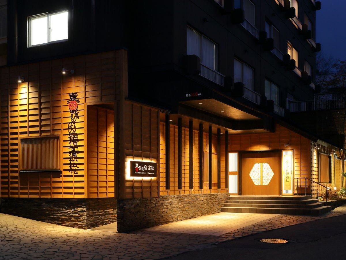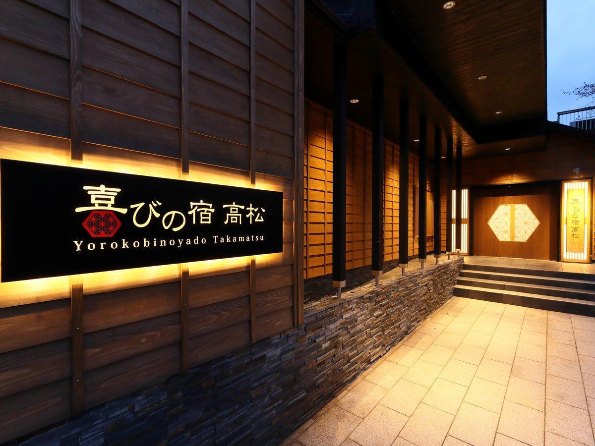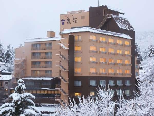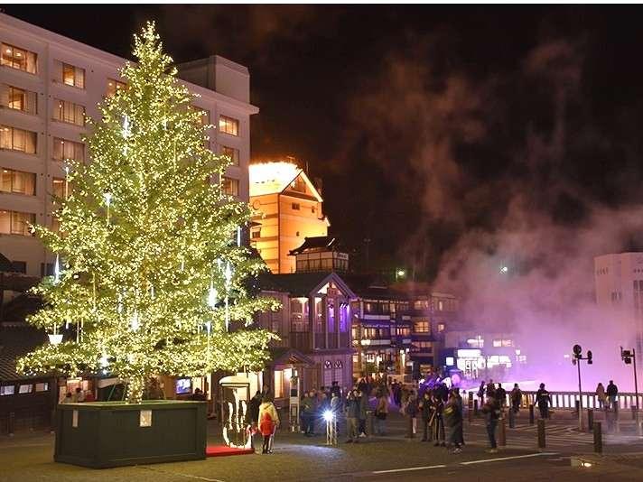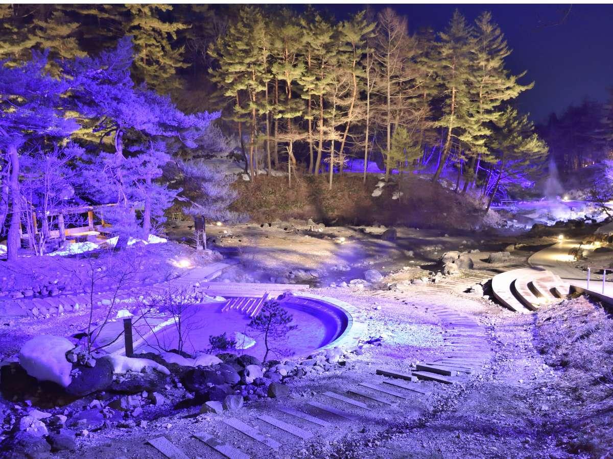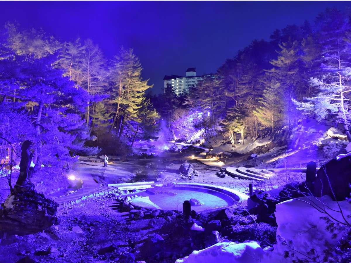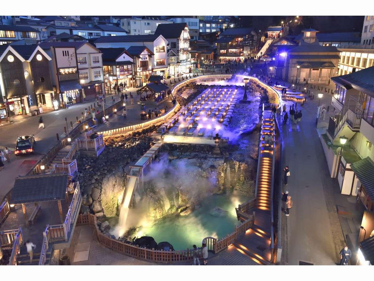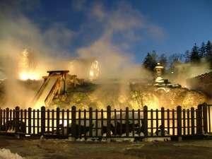 湯畑源泉が掛け流されている夕刻の露天風呂「泉」(岩風呂・樽風...