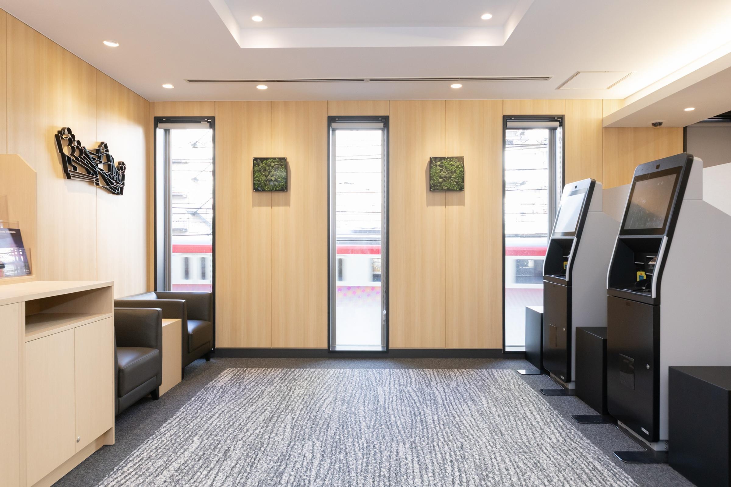 自動チェックイン機2台とフロントカウンターにてお客様をお出迎...