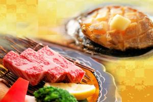 ①「但馬牛陶板焼」 ②「鮑陶板焼」 よりお1人様ずつ別々にお選びいただけます。