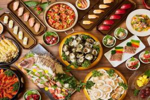 和・洋・中のお好みのお料理に日替わりステーキ(ビーフ・ポーク・チキン)、サザエつぼ焼き。伊豆ならではの鯛や鯵のお刺身など楽しめます。