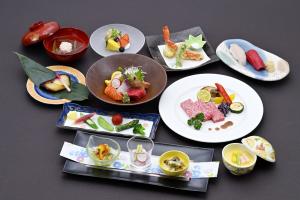①旭川市近郊産野菜プレート ②前菜3点 ③お刺身6点 ④富良野牛サーロインステーキ ⑤焼物 ⑥蒸し物 ⑦天ぷら4種 ⑧ごはん ⑨汁物 ⑩デザート